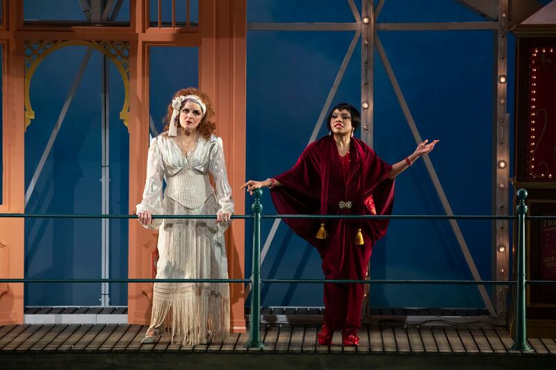 She pays special tribute to the designers and operators of the massive brachiosaur and woolly mammoth the Antrobuses keep as pets. Then there is working on Broadway’s most impressive set of the season; a recreation of the Atlantic City boardwalk, complete with full-length slide. “It’s a gift to inhabit such a rich and colorful world. No acting is required. You just feel the fun, abandon, and sinfulness of it all.”