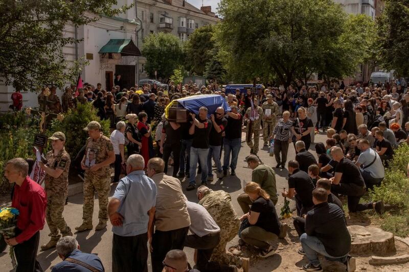 Men carry coffins during the funeral of six Ukrainian servicemen, who were killed after Ukraine launched its offensive at the Russian border region of Kursk.