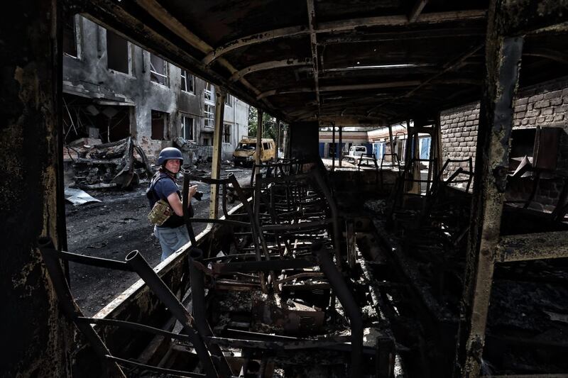 A journalist works near burnt wreckage of vehicles and a building damaged due to hostilities in Sudzha, Russia, in the Kursk Oblast.