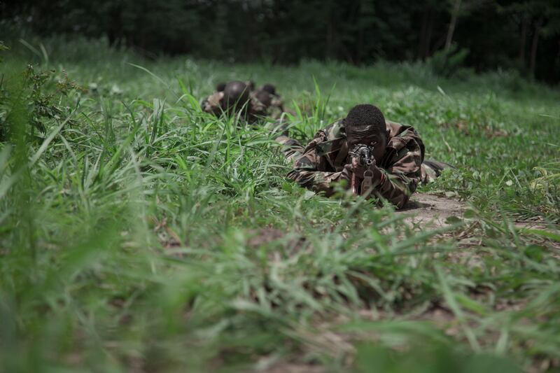 A Central African soldier trains with the AK47 assault weapon on the European launch pad at Camp Kassai, in Bangui, on March 14, 2018. At this location, the European Union training mission in the Central African Republic (EUTM CAR) trains FACA soldiers to be deployed in the country.