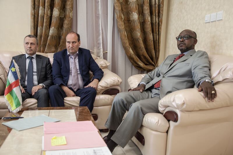First Secretary at the Russian Embassy in the Central African Republic Victor Tokmakov (L), Special Security Adviser to the Central African President Valeriy Zakharov and Minister of Communication and Government Spokesman Ange Maxime Kazagui (R), meet in the office of the administrative building, on Aug. 2, 2018 in Bangui, shortly after three Russian journalists were killed during a reporting trip in the country.