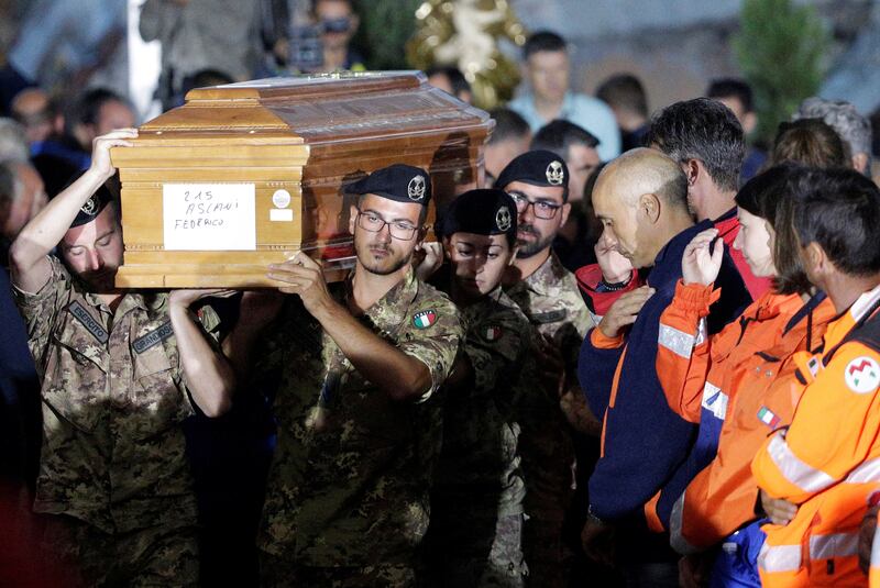 Authorities had hoped for a collective state funeral at a hangar in Rieti where all Amatrice’s dead could be essentially lined up and laid to rest together. The first funeral was held on Saturday, when the 34 residents of the small village Ascoli Piceno who died in the earthquake were buried quickly in absence of a functioning funeral parlor able to embalm all the victims in a timely manner.