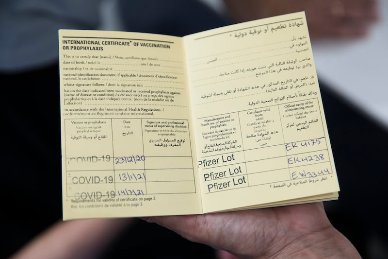 A woman presents a vaccination book with three doses of COVID19 vaccine recorded at Sheba Medical Center on July 14, 2021 in Ramat Gan, Israel.