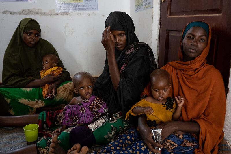 Somali mothers feed their malnourished babies a feeding paste at the Danwadaag Mother and Child Health Center, as Somalis struggle to cope with famine conditions due to four failed rainy seasons in a row, and conflict with Islamist Al Qaeda-linked Al-Shabaab rebels, on November 9, 2022 in Baidoa, Somalia.