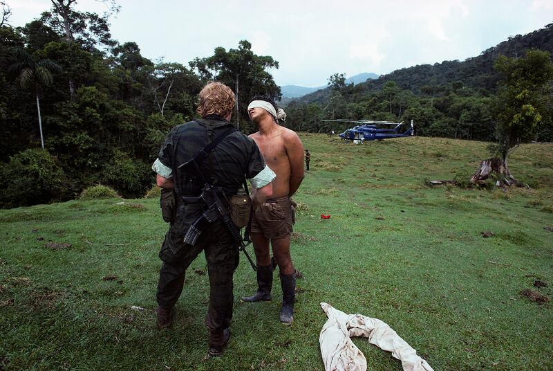 A DEA agent stands with a blindfolded prisoner following a raid on a cocaine lab in the Peruvian jungle.