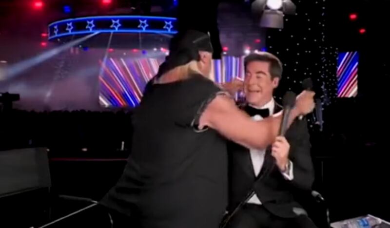 Wrestling legend Hulk Hogan ripped his shirt open before pouncing on Fox News host Jesse Watters during a live broadcast from President Donald Trump’s Liberty Ball.