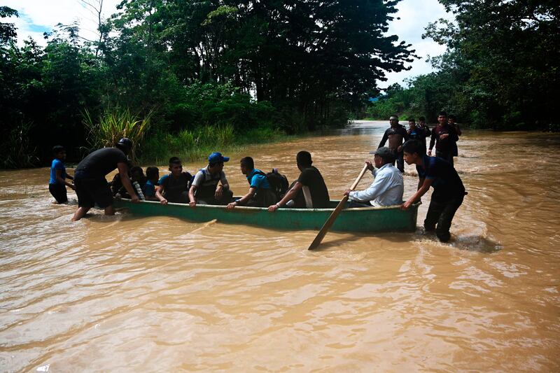 People had to resort to traveling by boat in a flooded area in Panzos, Alta Verapaz.