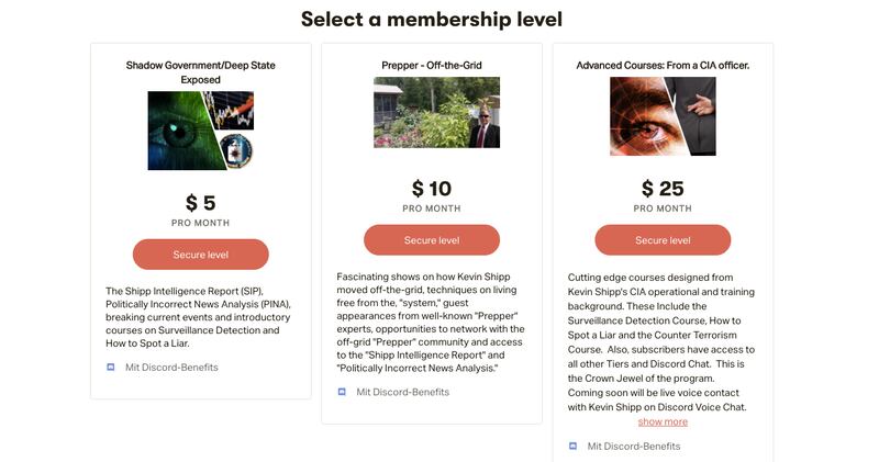 Shipp calls the lowest tier on his Patreon the “Shadow Government/Deep State Exposed.” For $5 a month, he offers two “intro” courses and a selection of his punditry—webcam videos dressed up with CIA logos, operative jargon, and serious-sounding acronyms: the Politically Incorrect News Analysis (aka “PINA”) and the Shipp Intelligence Report (codenamed “SIR”). Upgrade to $10 a month—the “Prepper-Off-The-Grid” tier—and Shipp will explain how he moved to an “off-the-grid farm in the American southeast,” undetectable even by satellite, and offers techniques on “living free from the ‘system.’” But the real heads, who shell out $25 each month, get “Advanced Courses: From a CIA officer.” These “cutting edge courses designed from Kevin Shipp’s CIA operational and training background” (his words) include “Surveillance Detection,” “How To Spot a Liar,” and “Counter Terrorism.” An extra $5 a month gets you “Advanced Protective Operations for VIP protection details.” “This is the Crown Jewel of the program,” Shipp says. There’s also a Discord.