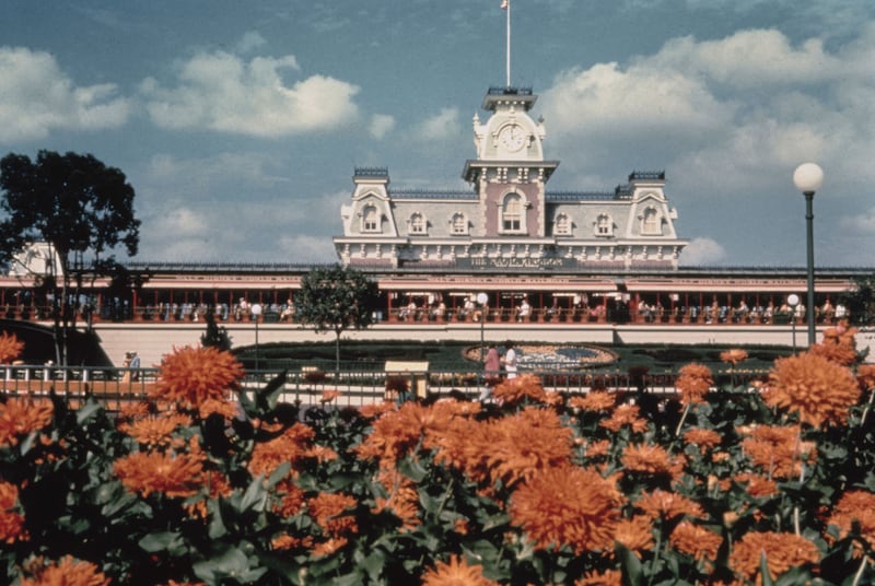 View of the Main Street Railroad Station in the Magic Kingdom in Disney World in the 70s