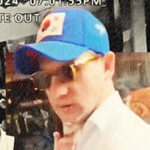 Surveillance video clearly shows a man with a blue baseball hat, sunglasses, untucked white shirt, blue pants, loafers (no socks), and a tote alongside a golden retriever with no leash. It also shows Wolff with his phone trailing the man, who turns and suddenly swings his tote at Wolff, hitting him in the head, and knocking him down.