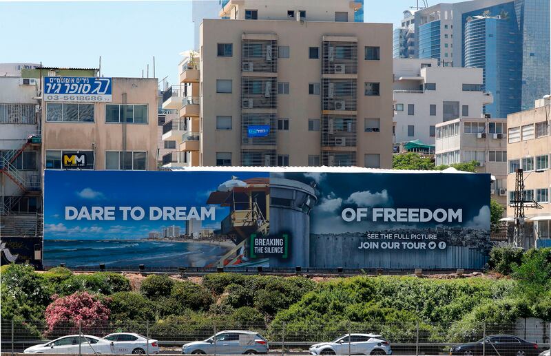 An anti-occupation billboard, by Israeli NGO Breaking The Silence, erected on a street in the Israeli coastal city of Tel Aviv.