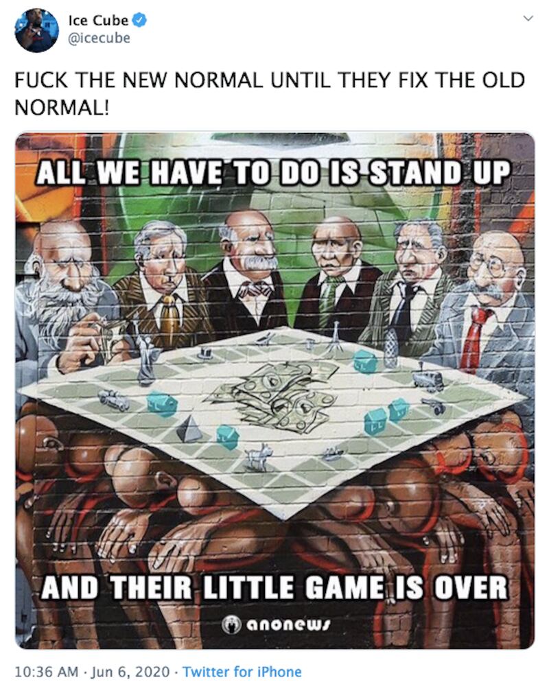 On Wednesday afternoon, amid a global pandemic that’s killed more than 400,000 people, a civil rights movement for black lives hitting all 50 states (and beyond), and a billionaire author’s childhood-shattering campaign of hate, the rapper Ice Cube apparently decided it was the perfect time to unleash a torrent of tinfoil-hat conspiracies—including several anti-Semitic memes suggesting that Jews are fomenting the oppression of black people.