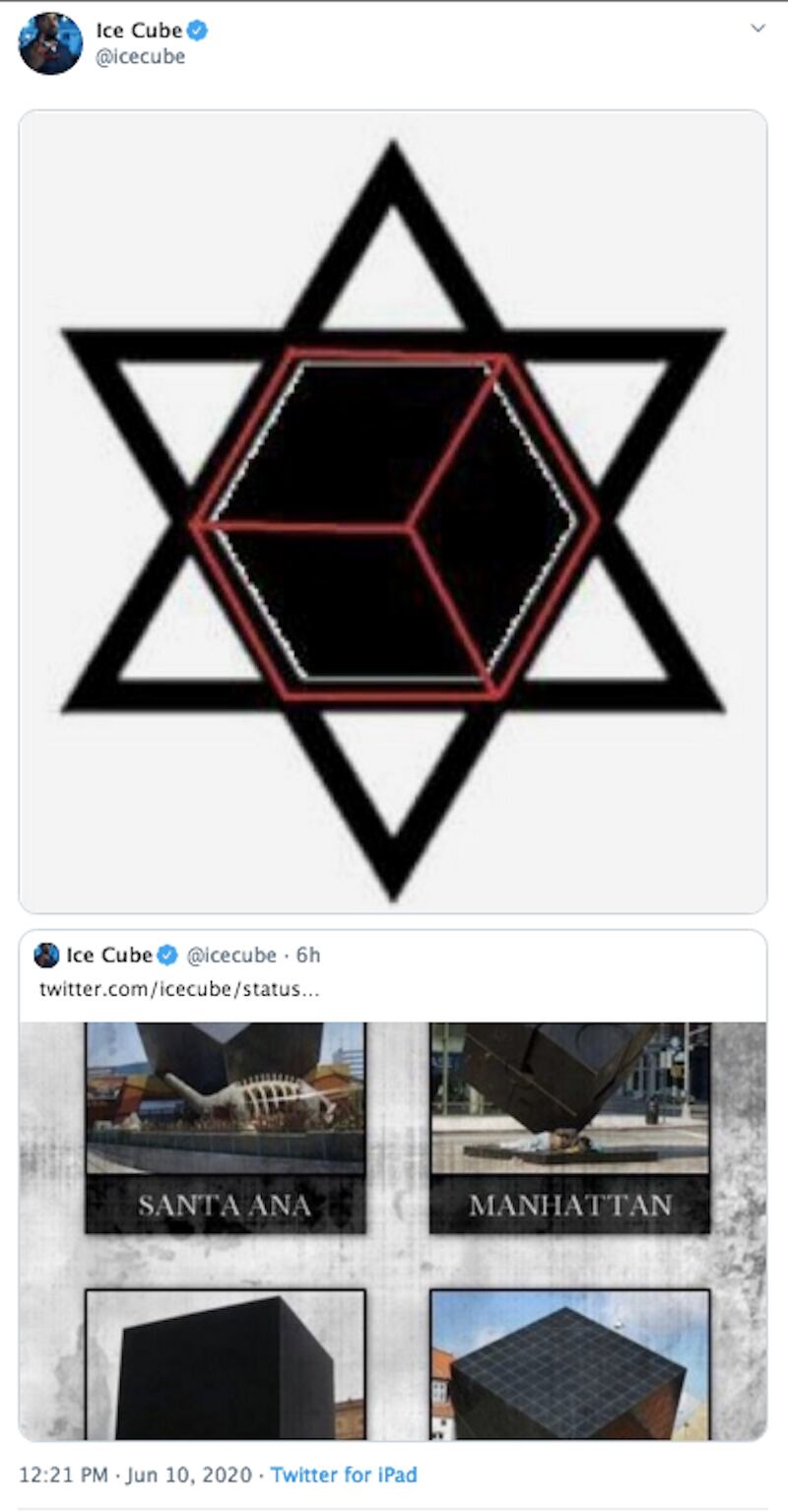The image in question, what those with vivid imaginations have come to call the “Black Cube of Saturn,” has ties to the occult—the entirely unsubstantiated idea being that it’s a sign of chaos. Further, placing it inside a Star of David heavily implies that the Jewish people are stoking the flames. The 50-year-old artist’s decision to spread such a hateful message to millions is especially troubling given his long, dark history of anti-Semitism. (Ice Cube did not respond to requests for comment; on Twitter, responding to charges of anti-Semitism, he wrote: “What if I was just pro-Black? This is the truth brother. I didn’t lie on anyone. I didn’t say I was anti anybody. DONT BELIEVE THE HYPE. I’ve been telling my truth.”)