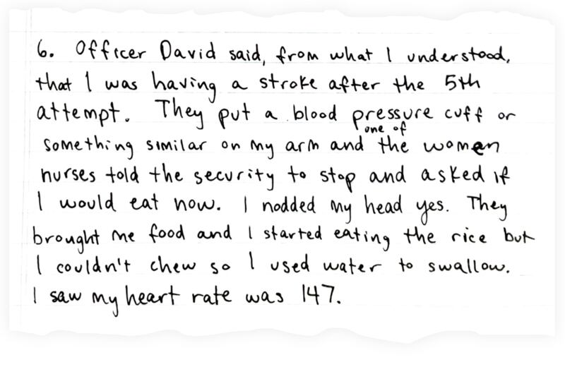 “He attempted and was documented as eating half of his solid food lunch (black beans, rice, and chicken) but he notes that chewing was very difficult for him,” it goes on. “It was only when the facility forced an immediate transition to solid foods and he had difficulty eating the foods that he declined—while still being amenable to other foods.”