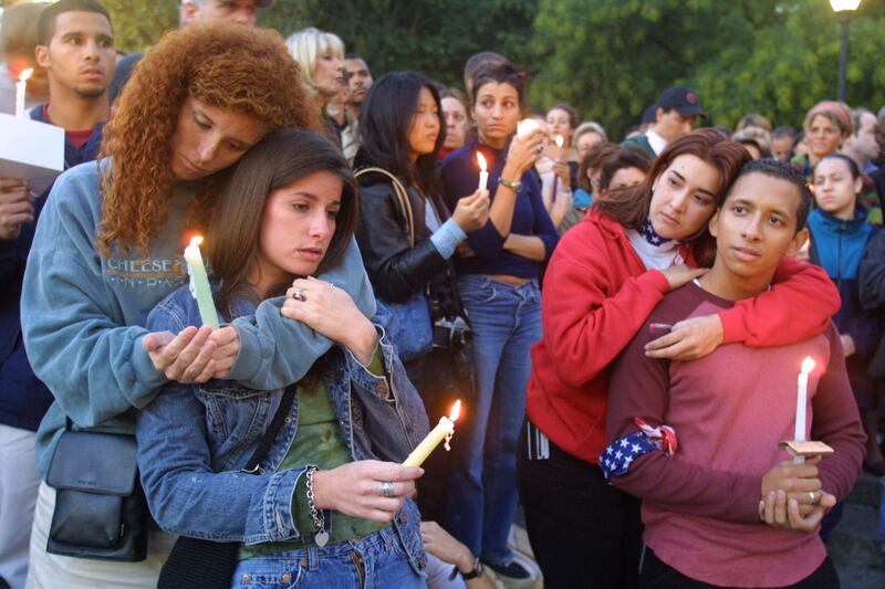 People mourn for the victims of the attack on the World Trade Center and the Pentagon during a candlelight vigil at Union Square Park in Manhattan on September 14.
