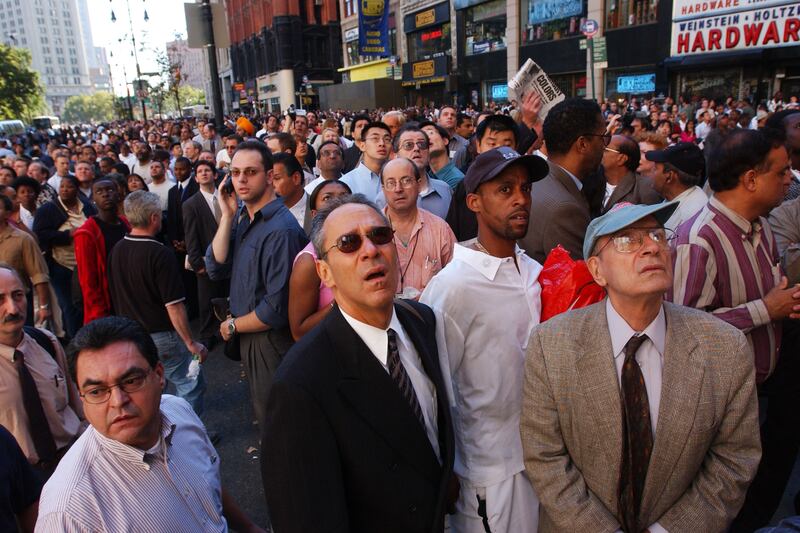 A stunned crowd gathers to watch the Twin Towers burn after two hijacked airplanes crashed into them.