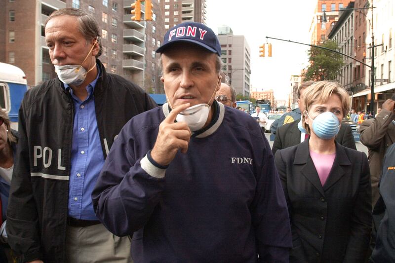 New York Gov. George Pataki, New York City Mayor Rudolph Giuliani, and Sen. Hillary Rodham Clinton tour the site of the World Trade Center disaster the day after the attack.