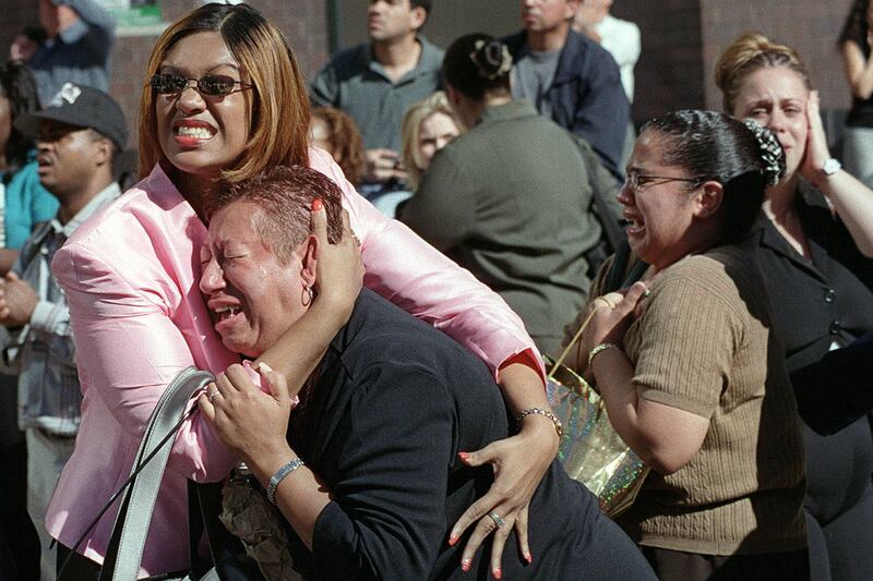 Two women hold each other as they watch the World Trade Center burn following the terrorist attack.
