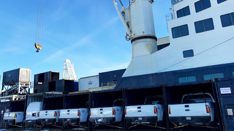 Cargo is controlled by first officer Mathieu Roy. Unheated blue containers carry vehicles and building materials. Blue containers with open tops transport dangerous goods. White containers are temperature controlled. Oversized cargo and farm animals get special containers. On the dock, forklifts help with transfers.