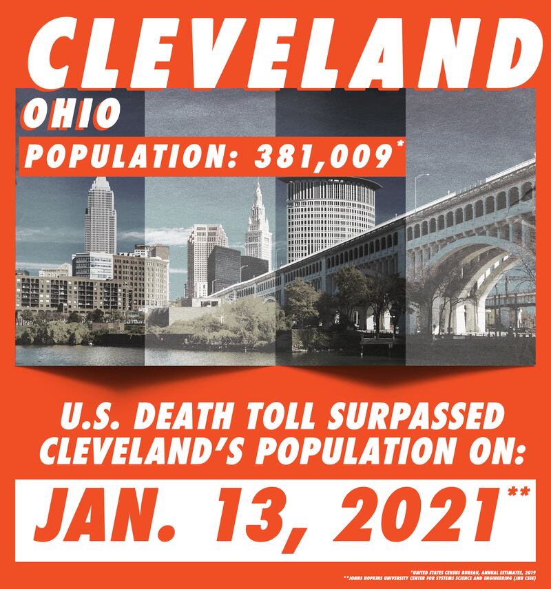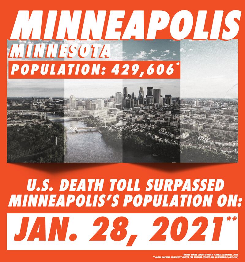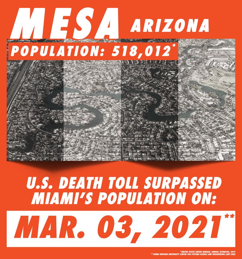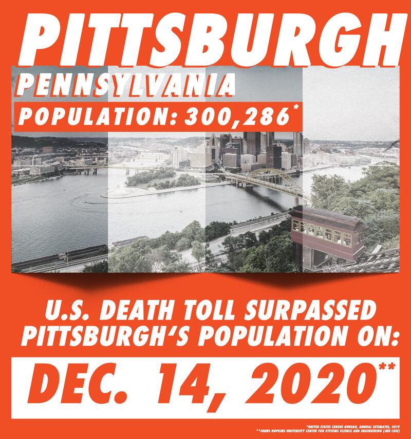 In an effort to convey the lethality of the novel coronavirus in the United States, we looked to major American cities to see how their populations compared to the national loss of life. Below, 11 major U.S. cities that as of the most recent Census estimate counted fewer than 500,000 people as inhabitants—and where the national equivalent of their entire population has now been claimed by an unprecedented scourge.