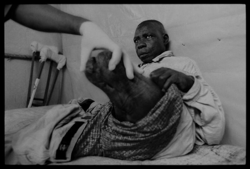 A man whose leg was amputated after he was wounded in battle is examined at a MSF hospital in Congo.