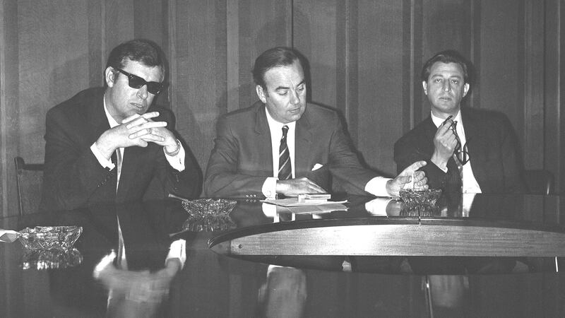 Rupert Murdoch (centre) with Albert Larry Lamb seen here at a press conference a few days before the relaunch of The Sun.