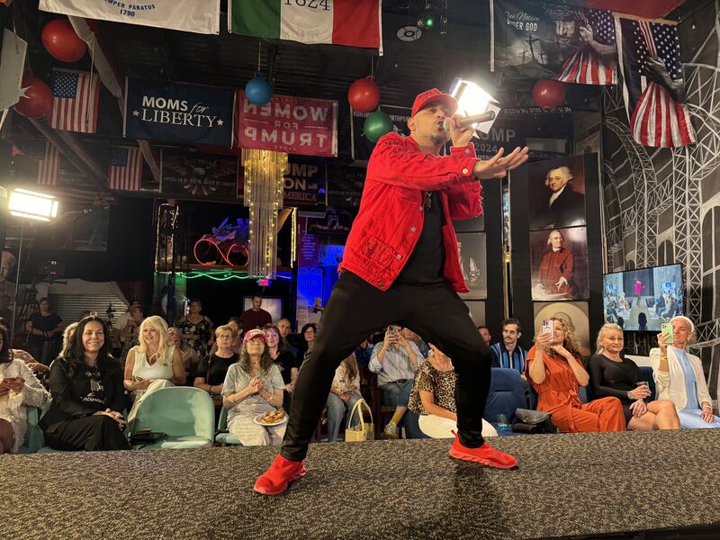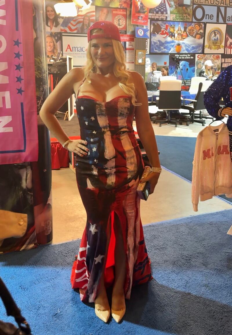 Floating through the crowd wearing a mermaid-style gown painted with Trump’s face was artist Lena Ruseva, who also goes by “MAGA-Langelo.” Her specialty is putting Trump’s face on different famous characters, like Hercules and the Wizard of Oz; her website sells murals for up to $7,000. Trump owns three of her paintings, Ruseva claimed.