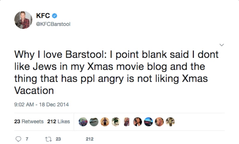 To be clear, not all of Barstool’s readership identifies as Stoolies. Plenty flock to the site simply because they dig Sollenberger and Katz, and try their best to ignore Portnoy’s behavior. Were it just a question of garbage opinions and bigoted humor, Barstool wouldn’t be particularly noteworthy. Even within the limited world of sports blogs, there are plenty of online places people can go to wallow in revanchist attitudes. It’s the Gamergate-like way he, the site, and Stoolies go nuclear in response to the slightest criticism that sets Barstool apart.