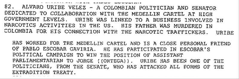 A declassified 1991 U.S. Defense Intelligence Agency report, obtained through the Freedom of Information Act and published in 2004 by the National Security Archive at George Washington University in D.C., offered a damning assessment of Uribe and his Medellín Cartel connections.