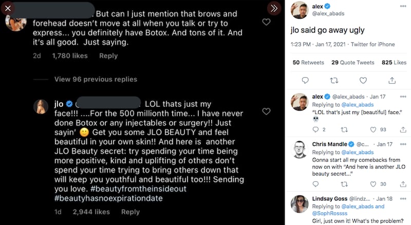 Later in the week when Lopez was promoting her new cosmetics line JLO Beauty, a foolish fan on an apparent kamikaze mission commented on one of Lopez’s Instagrams, saying that it’s hard to take the promotion for the products seriously when it looks like she’s clearly had Botox.