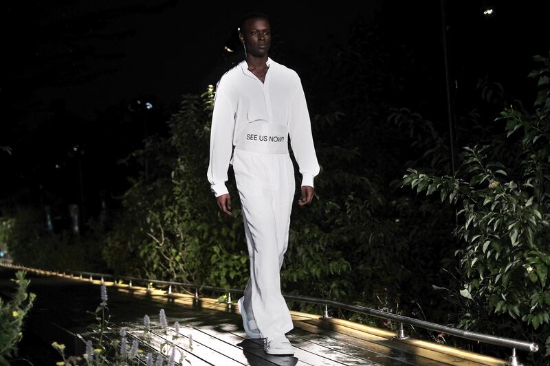 The clothes came with clear messaging. In a man’s all-white ensemble, a cumberbund read: “See us now,” and the FUBU (For Us By Us) emblem and logo featured in multiple looks.
