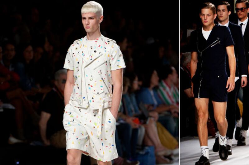 A full-length short-sleeve suit, a motorcycle-inspired multi-zipper shorts getup, and a boldly printed, crystal-embellished onesie came down his runway on Sunday. “Rompers are a new way of producing fashion for men,” says Decio Vitali, a fashion editor at Italy’s Collezioni magazine.