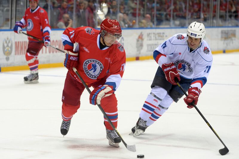 After basking in the glow of the Sochi Winter Olympics, Putin returned to the site of the Games to cross sticks in a gala match of the National Amateur Ice Hockey Teams' Festival on May 10, 2014.