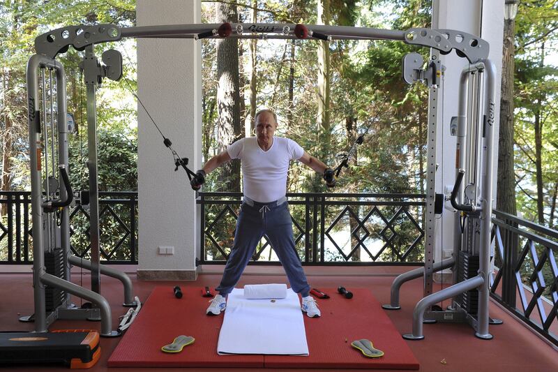 Russian President Vladimir Putin exercises in a gym at the Bocharov Ruchei state residence in Sochi, Russia, August 30, 2015.