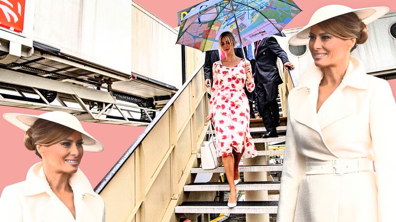 The trench-y look was classic Melania, with big shoulders, a high collar, and belted waist, the oversized silhouette puffed out like a shield. The incognito effect could be called an attempt to hide in plain sight—if it weren’t for that decidedly conspicuous frisbee pinned over Melania’s bun.