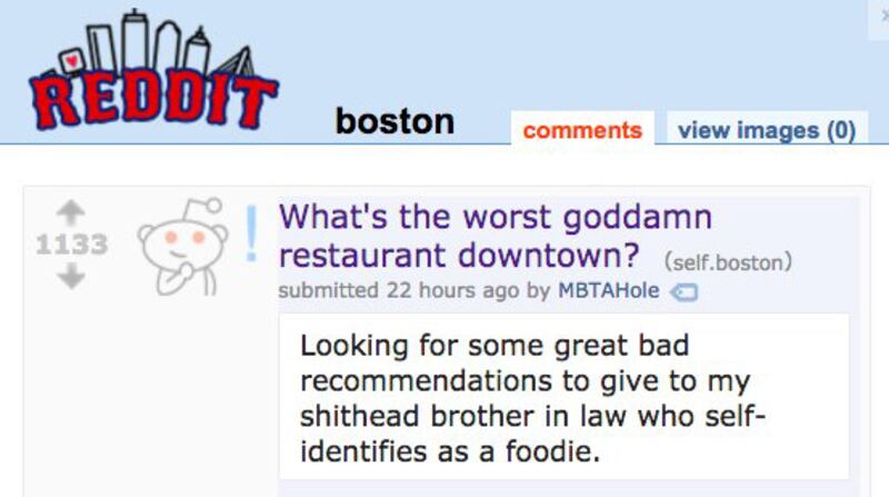 “What’s the worst goddamn restaurant downtown?” he asked Reddit under the name MBTAhole, a nod to the city’s defective mass transit system. “Looking for some great bad recommendations to give to my shithead brother-in-law who self-identifies as a foodie.”