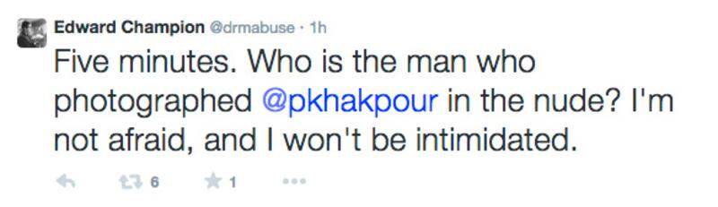 A shaken Khakpour immediately reached out on Twitter for help. But Champion made good on his threats, tweeting the name of the man then quickly deleting it.