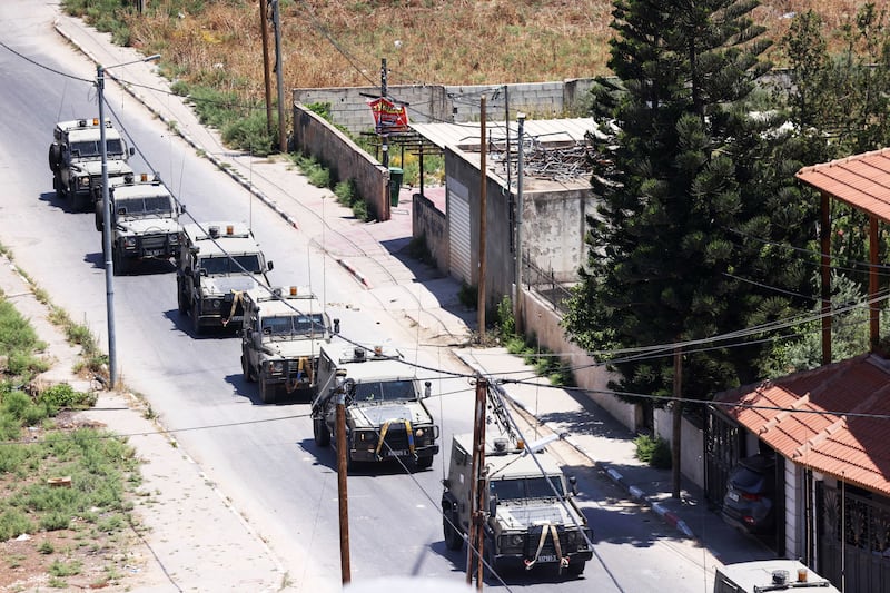 Israeli military armoured vehicles advance on a road during an operation in Jenin city in the occupied West Bank, on July 3, 2023.