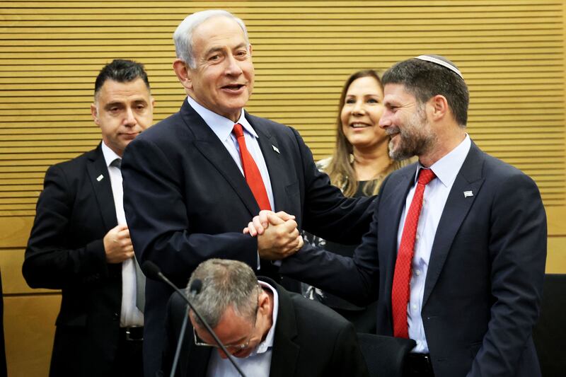 Israeli Prime Minister Benjamin Netanyahu (L) greets Finance Minister Bezalel Smotrich, during a media briefing ahead of a vote on the national budget, on May 23, 2023, at the parliament in Jerusalem.