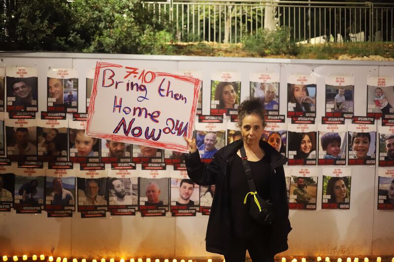Tom Mutch/The Daily BeastYet despite the shared suffering, Benjamin Netanyahu’s government has come under withering criticism for its failure to prevent the attack. Polls overwhelmingly show that most citizens of Israel across the spectrum believe he should step down either now or after the war is over. Most Israelis support the assault on Gaza, but even within Israel there are those who believe it is doing more harm than good. Last week, hundreds of protesters gathered outside the Knesset, Israel’s parliament, to call for the return of the 241 known Israeli hostages and pressure the government to do more to ensure their safe return. Marking 30 days since the massacres, they lit candles and held placards bearing slogans, the most prominent being ‘Bring Them Home NOW!’. This slogan is frequently seen throughout Israel on posters, T-shirts, and pendants.