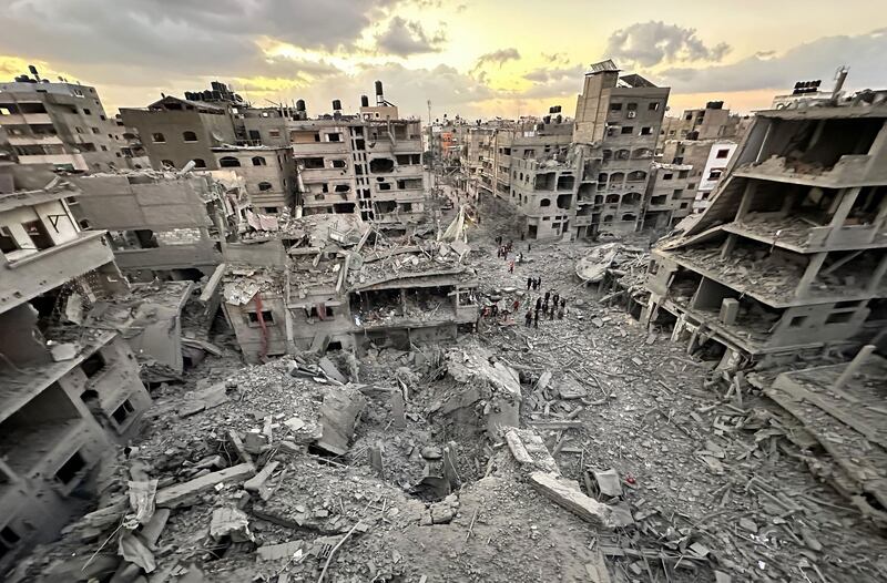 A view of collapsed, heavily damaged buildings after an Israeli airstrike on Beit Lahia town of Gaza on November 21, 2023.