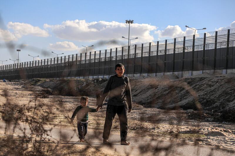 People walk on a road near the Gaza Strip's border with Egypt, Jan. 12, 2024.
