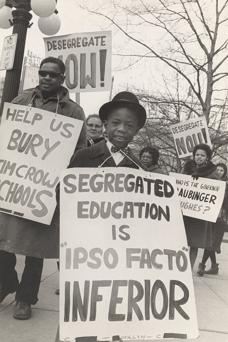 Boy picketing outside a local school, one of the many children who would play a critical role during the civil-rights era to advance the struggle for racial justice.
