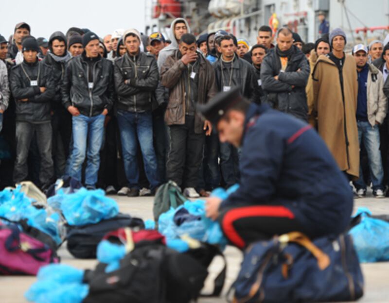 The battered hulls of hundreds of destroyed migrant boats are stacked like firewood along the port in Lampedusa, a tiny Italian tourist island 180 miles from the coast of Libya. Nearly 15,000 men, women, and children have made the 24-hour voyage across the Mediterranean to this tiny island since January 14, when Libyan leader Muammar Gaddafi’s naval guards stopped patrolling the waters off the North African coast to curb the flow of illegal immigrants to Europe.