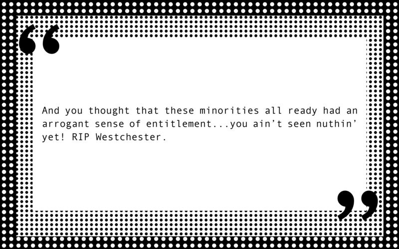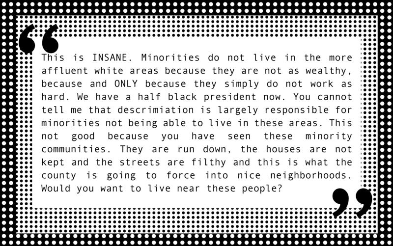 On the other hand, I knew from history and from the hundreds of comments we were getting that Westchester, limousine-liberalism notwithstanding, was deeply committed to maintaining the segregated status quo. Not all of the comments bore the crudely racist stamp of the ones reproduced throughout this article, but the vast majority shared two characteristics: (1) not bothering to learn about the decree’s actual provisions (which included development of some units that could be bought by families earning up to about $85,000 a year): and (2) believing that change must not be allowed to occur under any circumstances.