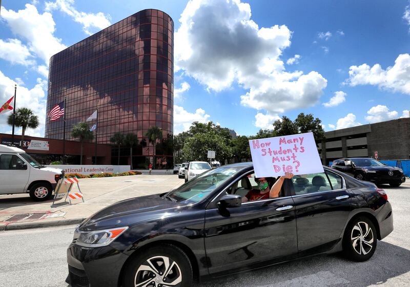 A teacher holds up a sign protesting Florida’s decision to open schools last summer.