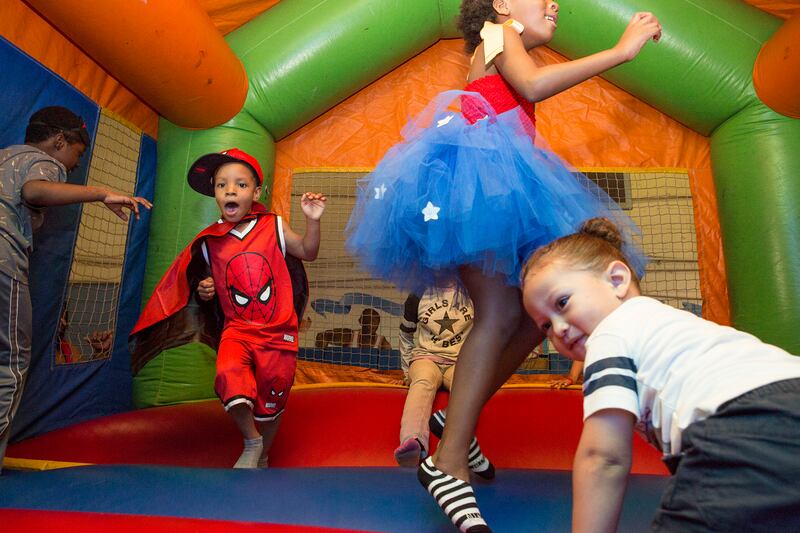 Jaheem Hunter, dressed as Spiderman, jumps in a bounce house at his birthday party.