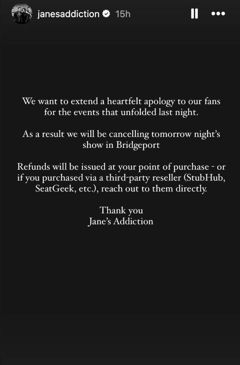 Alt-rock pioneers Jane’s Addiction canceled a Sunday show in Bridgeport, Connecticut and apologized for the brawl between bandmates Perry Farrell and Dave Navarro that played out onstage Friday night. “We want to extend a heartfelt apology for the events that unfolded last night,” they wrote in an Instagram story on Saturday. “As a result we will be cancelling tomorrow night’s show.” The band’s social media post also included refund information for ticket holders. During the group’s Friday show in Boston, Farrell and Navarro threw punches while playing their hit “Ocean Size.” The scuffle ended after crew members and bandmate Eric Avery restrained Farrell. According to Farrell’s wife, his outburst was sparked by a combination of him suffering from “tinnitus and a sore throat” and “mounting” frustration because “the stage volume had been extremely loud and his voice was being drowned out by the band.” She went on to accuse Avery of putting Farrell in a headlock and said he “punched him in the stomach three times.”