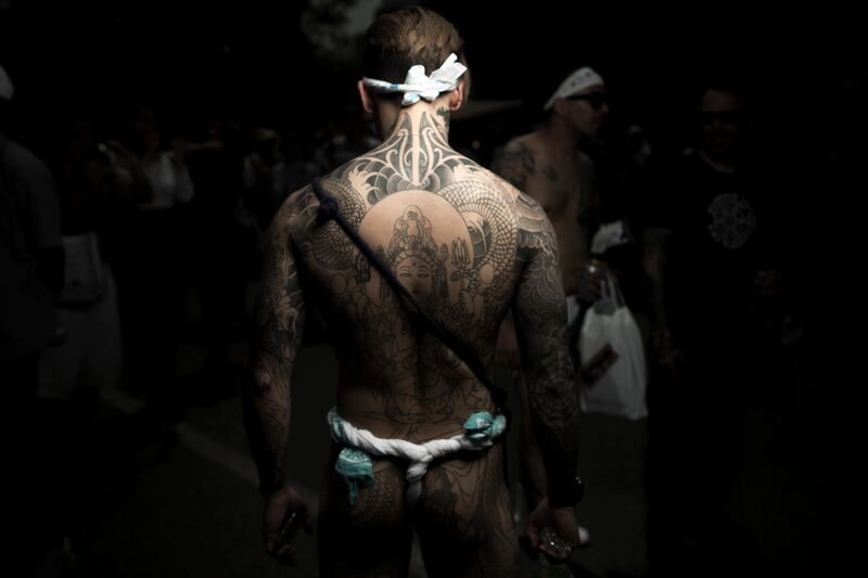 A man poses for photographs showing his "Irezumi" Japanese traditional tattoos related to the Yakuza's universe, during the Sanja Matsuri festival in Tokyo.