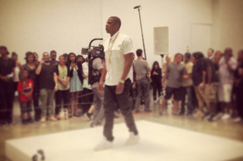 The scene recalled Kanye West’s impromptu performance at Art Basel in Switzerland last month, when he threw together a last-minute Yeezus “listening party” at Design Fair for art types to get a sample of his forthcoming album. In the span of a month, both West and Jay-Z have made great overtures to the art world, eager to align themselves with all things Abramovic and Warhol and Koons. Of course, the art world loves them back—but as soon as the mutual adoration is openly expressed, it suddenly feels uncool. Take, for example, the ham-fisted, name-dropping opening verse of “Picasso Baby”: “Jeff Koons balloons, I just wanna blow up Condos in my condos, I wanna row of Christie’s with my missy, live at the MoMa / Bacons and turkey bacons, smell the aroma.”